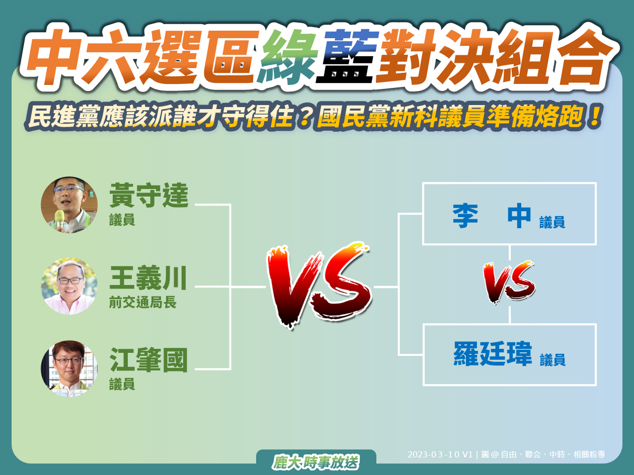 中六選區浮上檯面的人選有江肇國、黃守達、王義川,在賴清德在中執會中已經宣布「誠信條款」後,身為議員的江肇國與黃守達已經隱性出局。